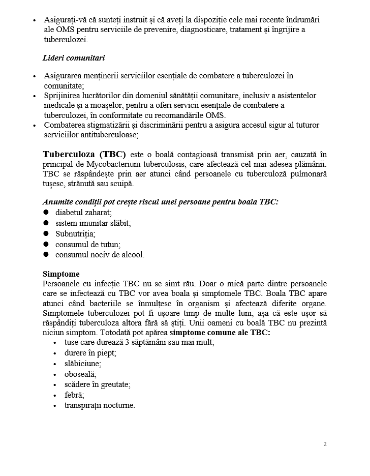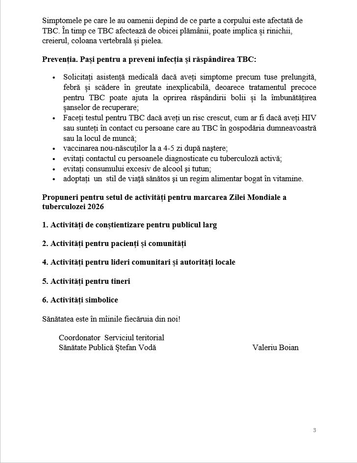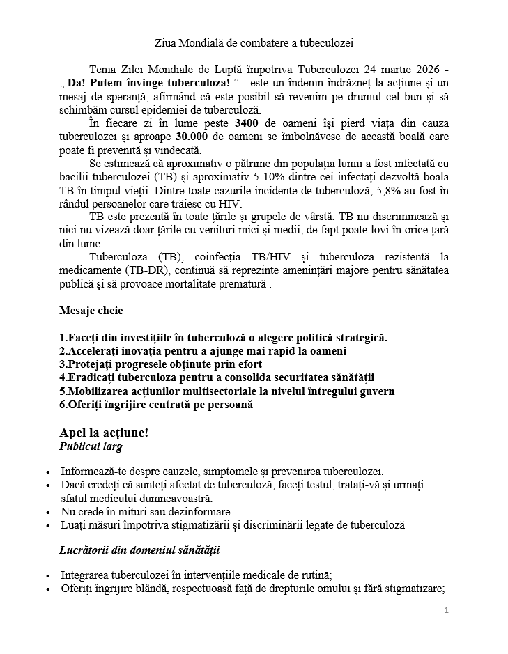 4. Ziua Mondială de Luptă împotriva Tuberculozei 24 martie 2026 – „ Da! Putem învinge tuberculoza! ”